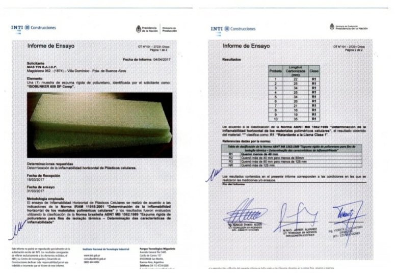 En el siguiente espacio agregamos las imágenes de los estudios realizado por el INTI. Creemos preciso dejar claro que el poliuretano es un producto abalado con normas nacionales para la utilización de sistema aislante para la construcción. Siendo el mismo un producto que entra en ignición y se propaga siempre que haya fuego y oxígeno presente. El producto no produce gotas encendidas. Y la clasificación de inflamabilidad es de R1, debido a que tiene un potente retardaste del fuego. Por lo tanto es un producto abalado para la utilización de sistema aislante para la construcción.